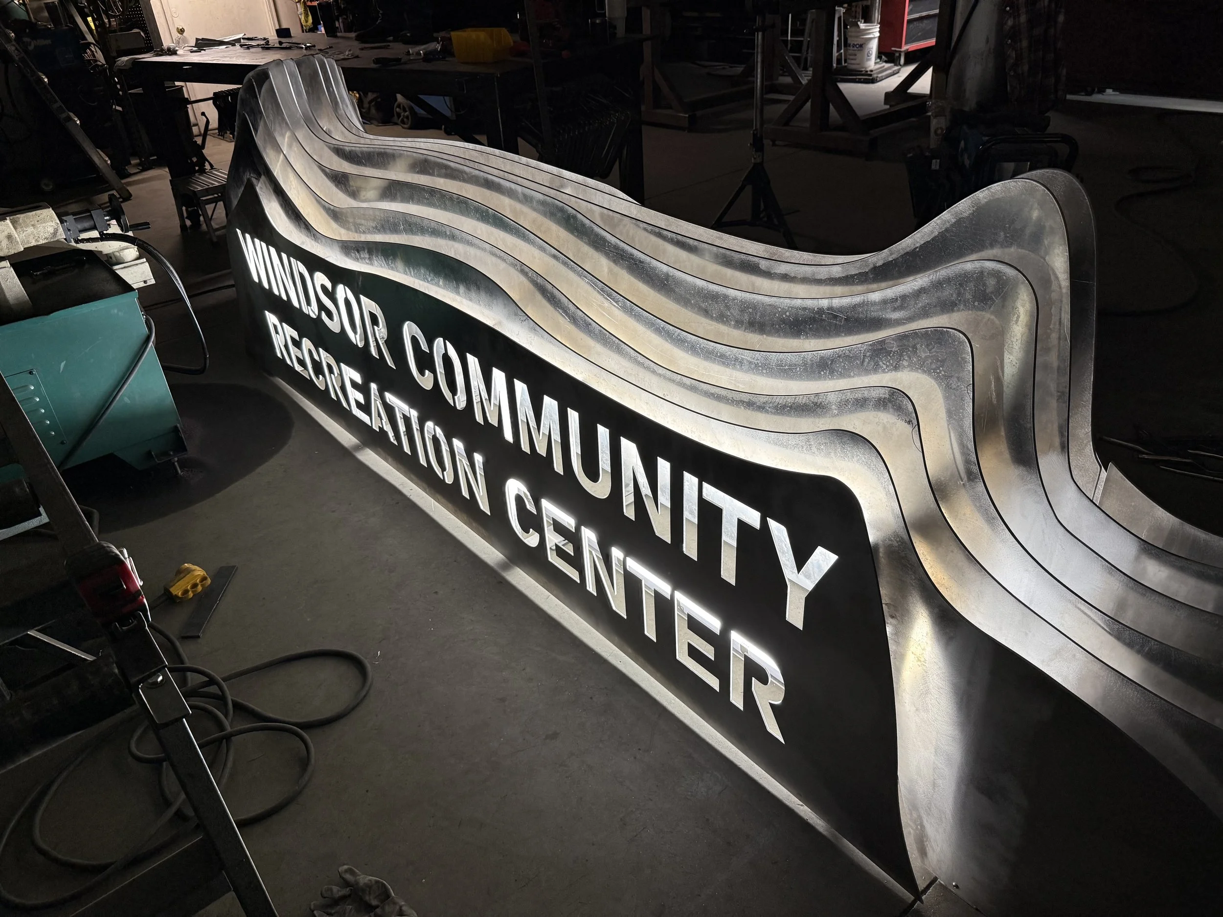 A two-part installation at the Windsor, Colorado Recreation Center- the piece takes it’s inspiration from the topography of the underground bedrock of the nearby Chache la Poudre River to form a freestanding monument sign at the street and a wall-mounted sign at the building entrance, making visible hidden aspects of a vital natural resource. Made of metal panels in 5 different colors, the piece is backlit with LEDs to transition is presence catching sunlight during the day to supplying light at night.