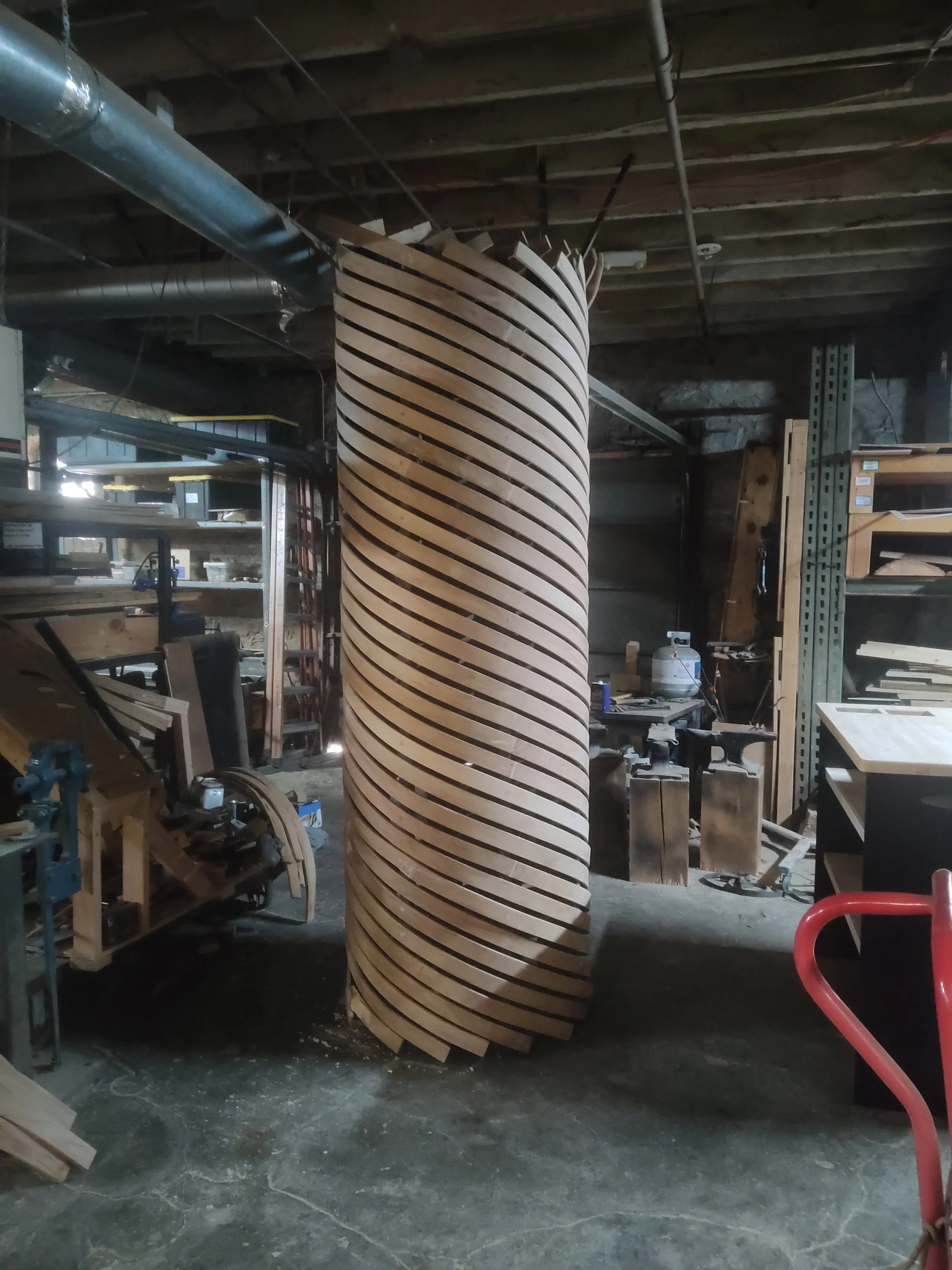 For Harbor Coffee as an artistic upgrade to their coffee shop facade. Informed by one of the owner’s history in the Navy, the piece takes inspiration from the way wooden ships are created- bending thinner slats of wood across a curved frame and using tension to create greater structure. In context with the area’s industrial history, another inspiration is the evolution of the Thonet bentwood chair. Beginning as a limited object made by craftsman, the chair was eventually built with standardized bends and was one of the first pieces of furniture to be flat-packed. The evolution of this chair mirrors Harbor Coffee’s desire for a design that meets in between Traditional and more Modern as well as fitting the methods of making contemporary with the building. The piece consists of functional pieces - a grade transition for the door, a planter growing Jasmine up the facade, a trellis providing shade for the window - grouped into a central column.